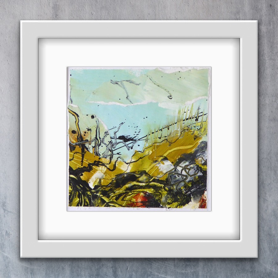 In this collection, I have continued to explore the use of bold marks and textures, to convey the wildness of this wonderful landscape, where gnarly trees force their way through the walls, where Wheatear ‘chuck-chuck’ at my intrusion, and the wind buffets constantly.  I’ve begun to use more collage to abstract the glimpses of the landscape that resonate and stay in my mind, and to use oils in the work, to create that organic glow that only mosses seem able to bring to the wildest of landscapes.