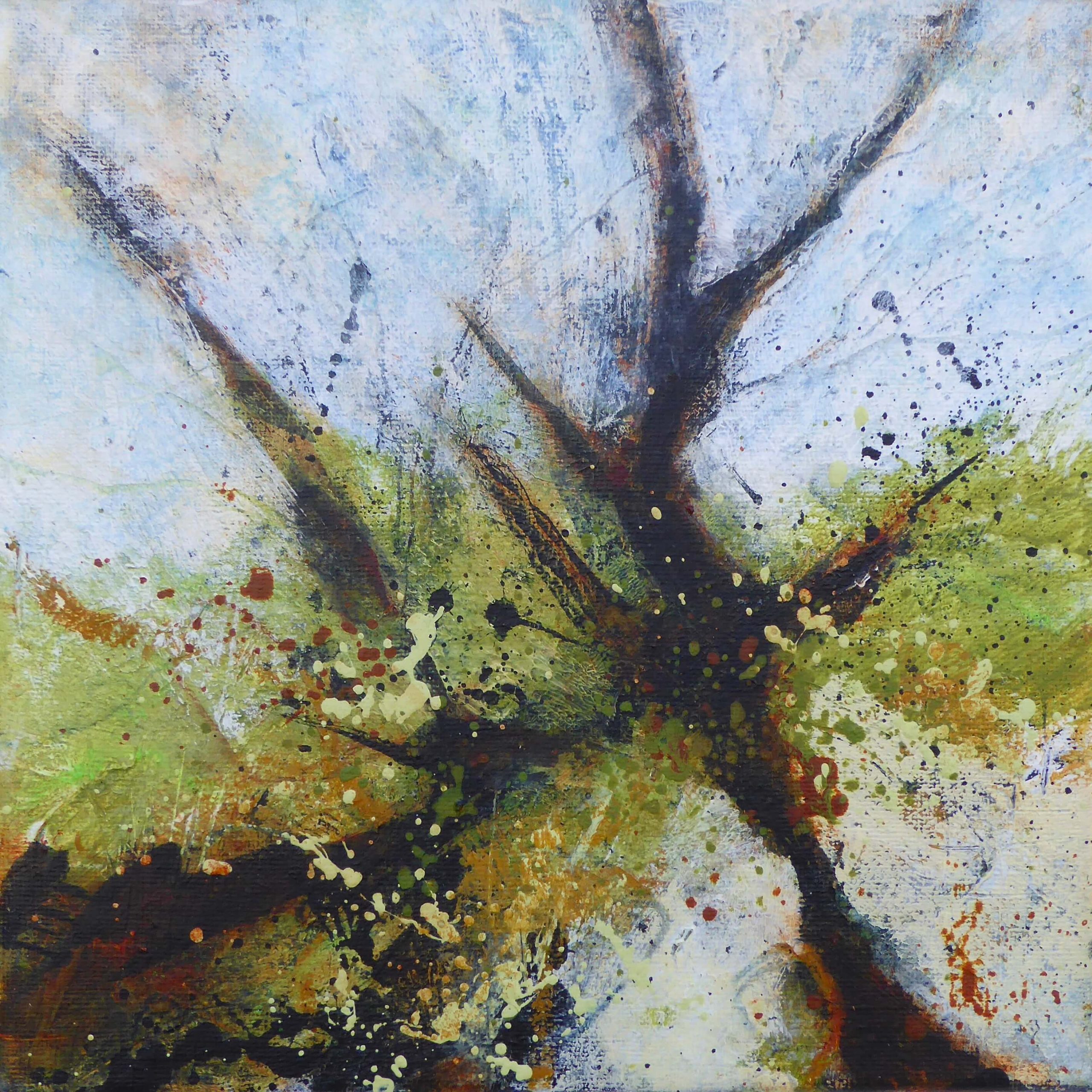 In this collection, I have continued to explore the use of bold marks and textures, to convey the wildness of this wonderful landscape, where gnarly trees force their way through the walls, where Wheatear ‘chuck-chuck’ at my intrusion, and the wind buffets constantly.  I’ve begun to use more collage to abstract the glimpses of the landscape that resonate and stay in my mind, and to use oils in the work, to create that organic glow that only mosses seem able to bring to the wildest of landscapes.